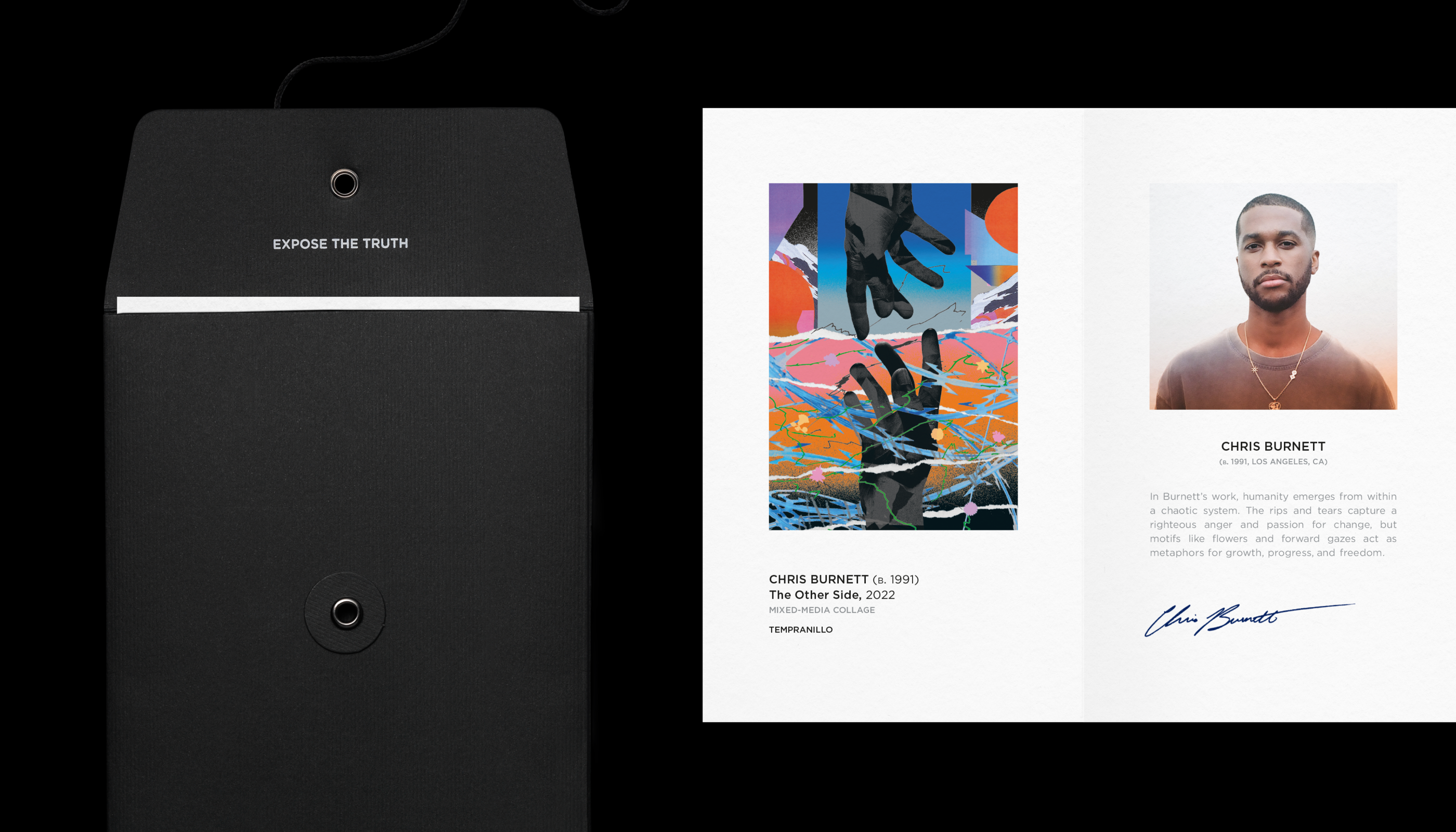 Inspired by official prison collateral we cinched tissue paper around each bottle with plastic zip ties and included a manila envelope enclosing information to ‘expose the truth’ about the criminal justice system. When consumers uncover the wine bottles from this solemn secondary packaging they discover an unexpected contrast—vibrant, hopeful art blazes from the wine labels, resetting expectations and inviting engagement with a daunting topic.