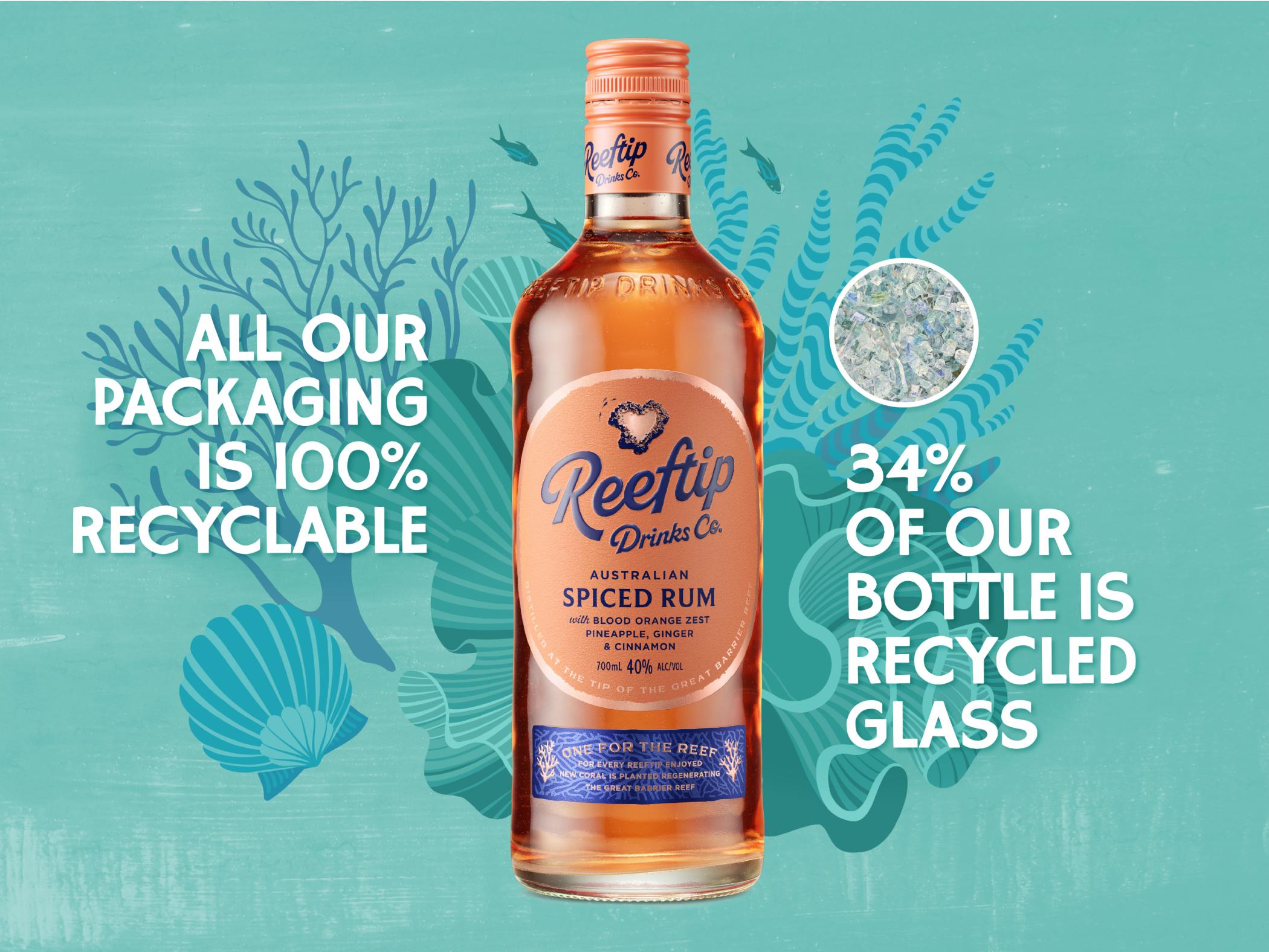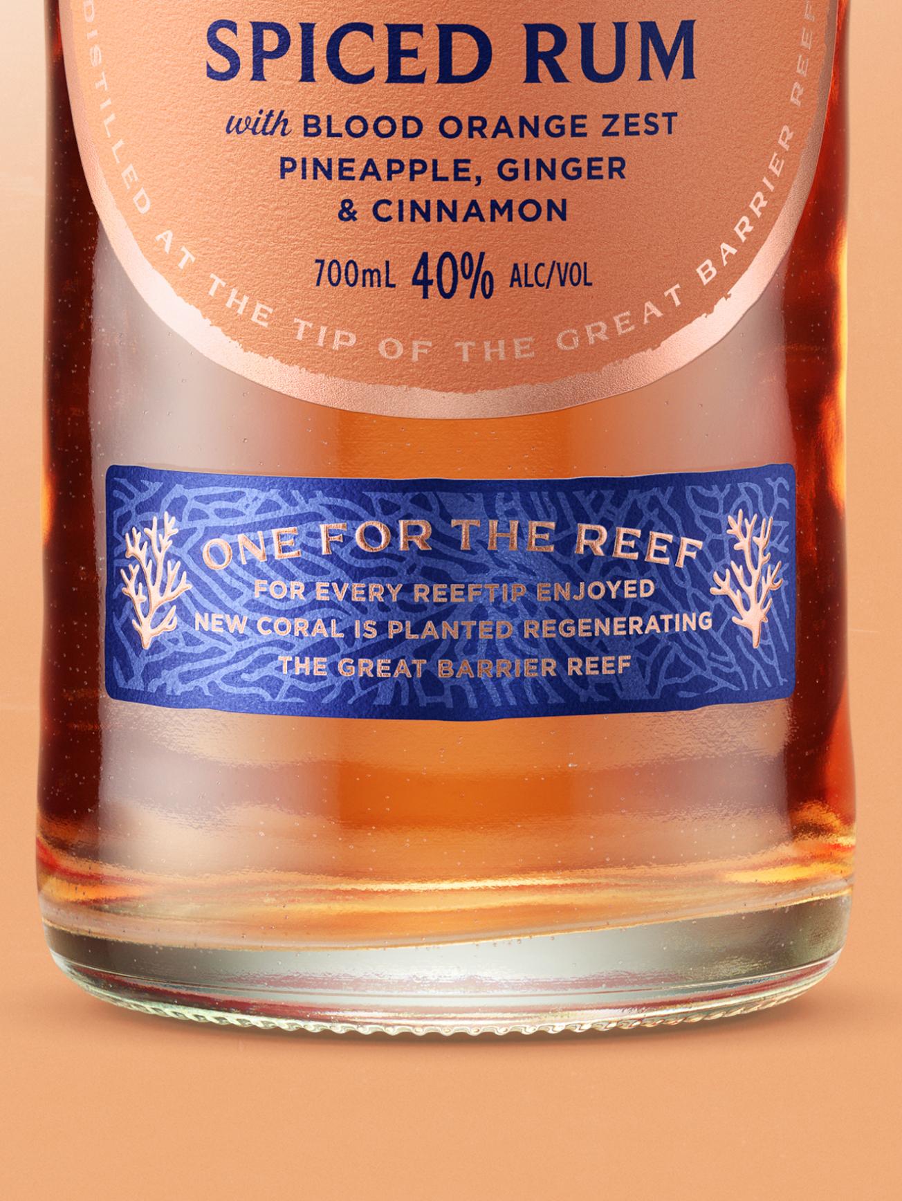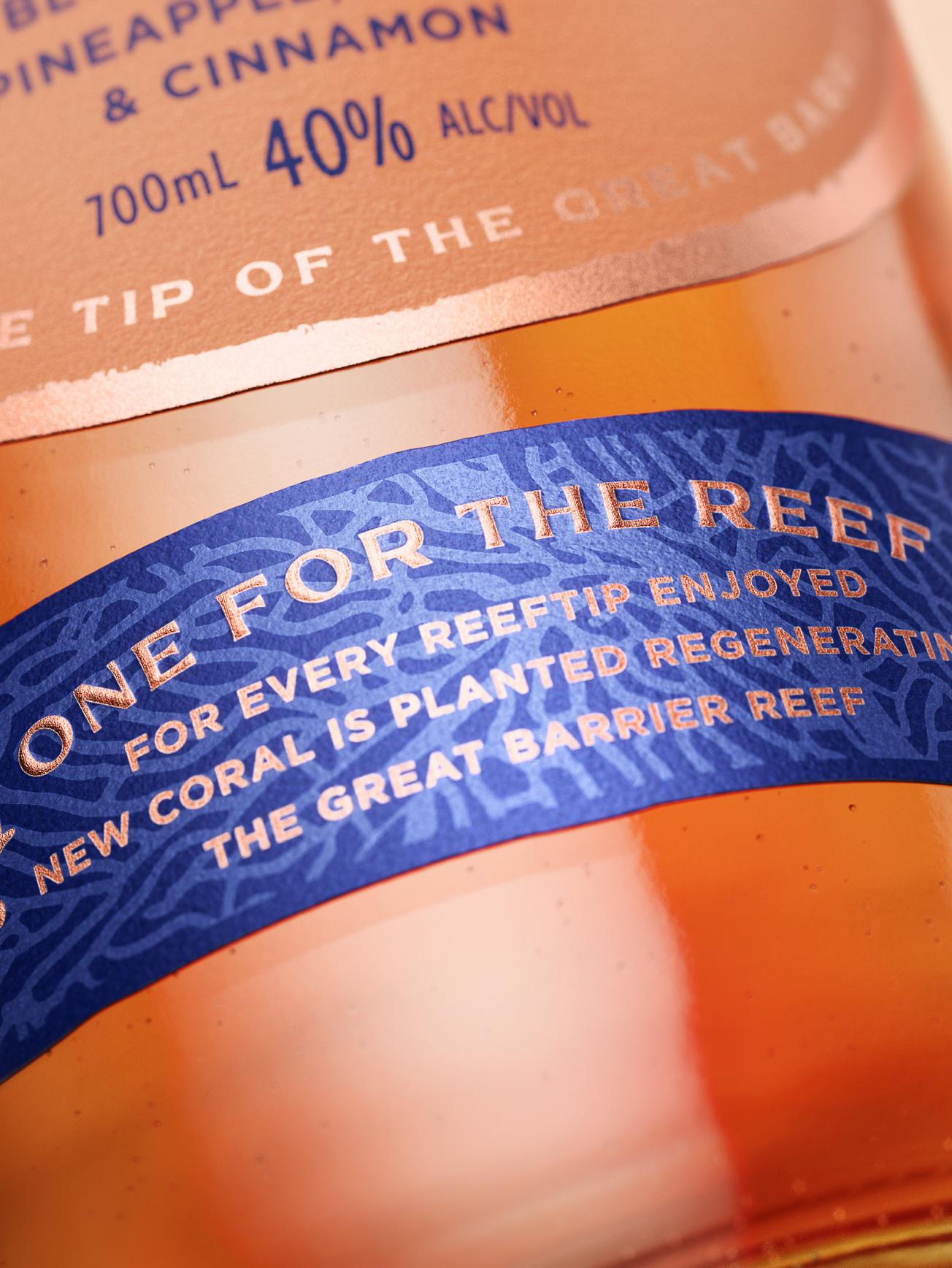 The well-being of the reef inspires every design and production decision. From the bespoke bottle, to the label stock made from recycled sugar cane waste, and, of course, the rum itself, made from distilling molasses, a by-product of sugar production.